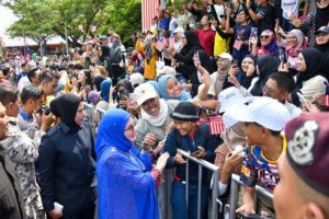 Al-Sultan Abdullah turut dilihat mendukung seorang kanak-kanak lelaki dan Tunku Azizah pula memberi isyarat ‘mini love‘, ‘flying kiss‘ dan melambai kepada khalayak ramai.
