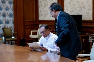 “Turut mengangkat sumpah sebagai Setiausaha Politik ialah saudara Ahmad Farhan Datuk Seri Fauzi dan saudara Chan Ming Kai. – BACALAHMALAYSIA.MY/FOTO FB RASMI ANWAR IBRAHIM