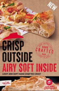 Setelah bertahun-tahun berkembang, kerak piza jenis Hand Crafted San Francisco yang terbaharu ini memberikan citarasa lembut dan ringan, garing di luar dan gebu di dalam, dicipta khas untuk menggembirakan selera para pencinta pizza terkini.